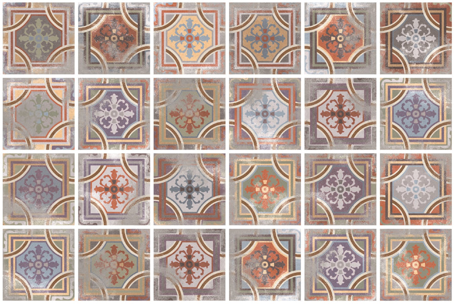 Denna vackra platta i format 20x20 cm kombinerar klassiska mönster med en modern twist. Med sina varma och kalla nyanser i harmonisk blandning skapar den ett levande golv som ger karaktär till både badrum, kök och hall.