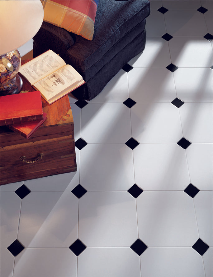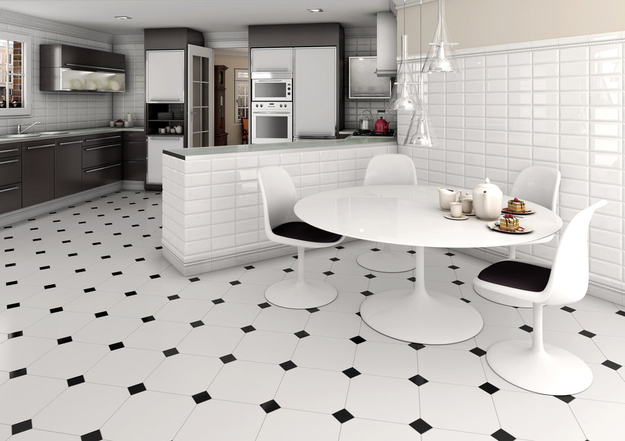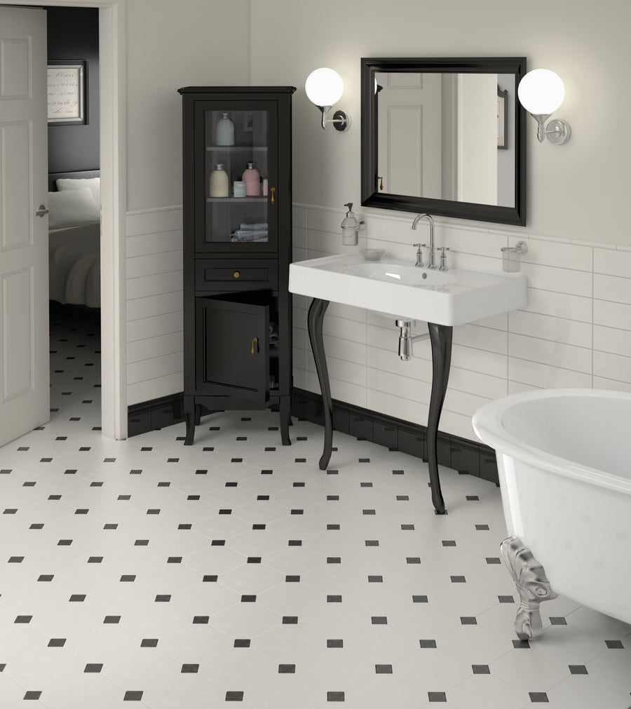Cosmo – klassisk elegans med en modern twist. Den ljusa golvplattan med svarta tozetter skapar ett tidlöst mönster som ger rummet karaktär och stil. Perfekt för dig som vill kombinera ljus och kontrast i kök, hall eller badrum. Cosmo – design som håller i längden