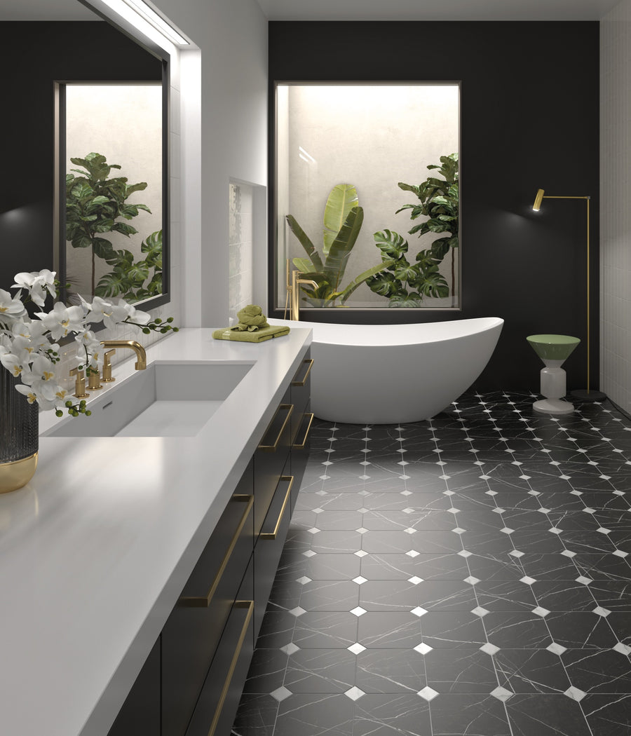 Skapa ett golv med både karaktär och elegans med Life Marmor 20x20, en serie som kombinerar det tidlösa oktagonformatet med en stilren marmorlook i vit eller svart. De vackra ådringarna och den matta ytan ger plattorna ett exklusivt och harmoniskt uttryck – perfekt för dig som vill lyfta helhetskänslan i badrum, kök, hall eller andra ytor i hemmet.