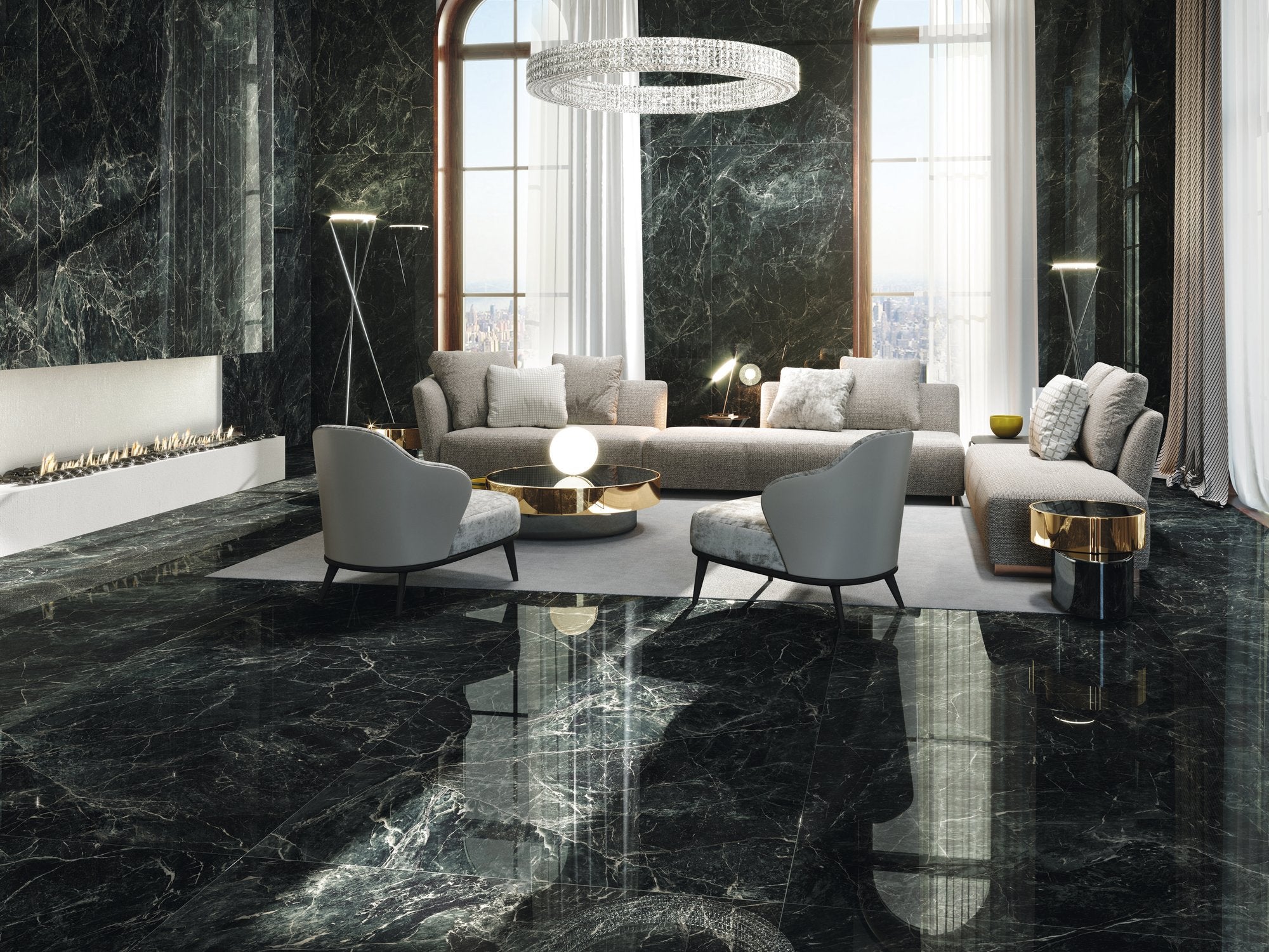 Ge rummet ett exklusivt lyft med Verde Alpi Grön/svart Marmor, en serie i granitkeramik som återskapar den djupa gröna färgen och de eleganta ådringarna hos naturlig marmor – utan det underhåll som äkta sten kräver.